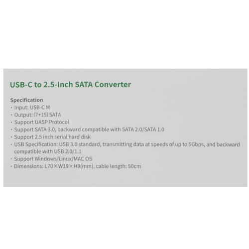 Кабель-адаптер UGREEN CM308 обеспечивает быстрый доступ к SSD и HDD 2,5 дюйма. Устройство для подключения жестких дисков оснащено интерфейсом SATA III 6 Гбит/с и USB 3.1 Type C, обеспечивает высокую скорость передачи данных до 5 Гбит/с.