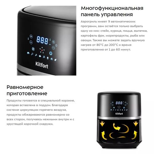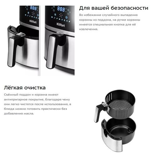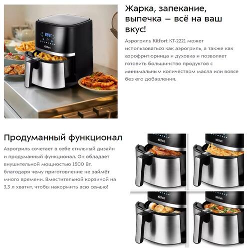 Благодаря понятным значкам удобно управлять сенсорными кнопками и понимать горящие индикаторы. Прибор Kitfort KT-2221 позволит настроить таймер на 1 ч, вручную задать нужный уровень нагрева или выбрать готовую программу. Система циркуляции воздуха гарантирует равномерный нагрев, а антипригарное покрытие исключит пригорание.