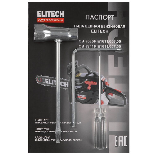 Бензиновая цепная пила ELITECH HD CS 5535F оснащена двухтактным двигателем внутреннего сгорания мощностью 3,5 л.с., работающим на смеси бензина и 2-тактного масла, приводящим в движение пильную цепь, двигающуюся по направляющей шине.
