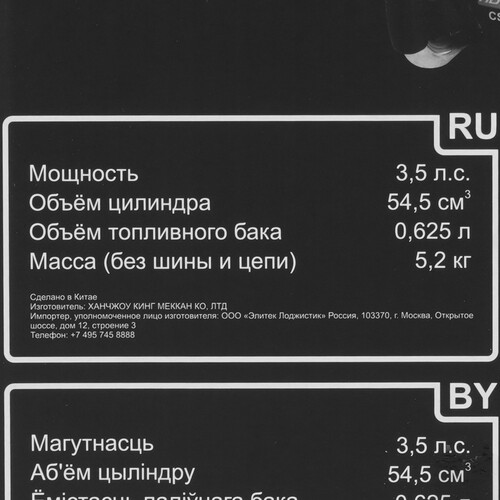 54.5 см³, 2600 Вт, 3.5 л.с., шина - 38 см, паз шины - 1.5 мм, шаг цепи - 8.25 мм (0.325"), 5.2 кг