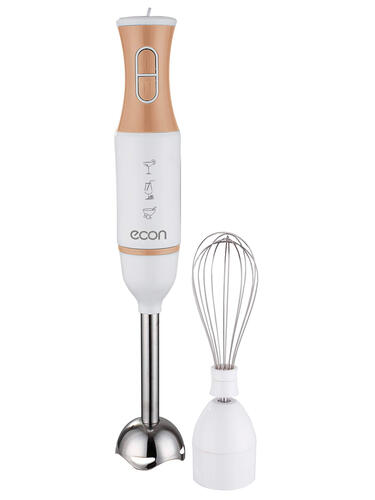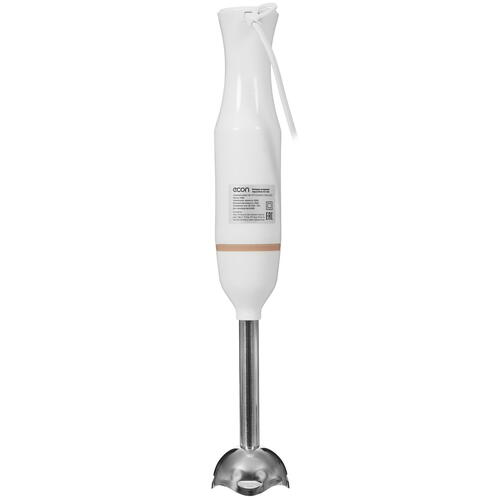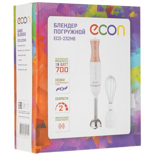 Насадки изготовлены из металла, который не покрывается ржавчиной и коррозийным налетом. Пластиковый корпус легко очищается от накопившихся пятен. Реализованный в приборе импульсный режим снижает нагрузку на двигатель в процессе обработки густых смесей. Непрерывная работа ECON ECO-232HB рассчитана на 50 с.