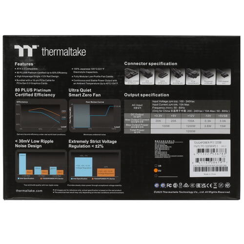 1200 Вт, 80+ Platinum, APFC, 20+4 pin, 2 x 4+4 pin CPU, 12 SATA, 16 pin (12VHPWR), 5 x 6+2 pin PCI-E