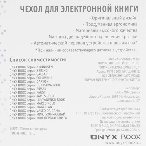 Чехол-книжка ONYX BOOX для ONYX BOOX Darwin/Faust/Vasco da Gama/Caesar защищает электронную книгу с диагональю экрана 6 дюймов от царапин, ударов, загрязнений и внешних воздействий со всех сторон. Аксессуар представлен в синем цвете. Внешняя сторона имеет отделку из искусственной кожи с приятным на ощупь покрытием, фактурными надписями и прошитыми краями.