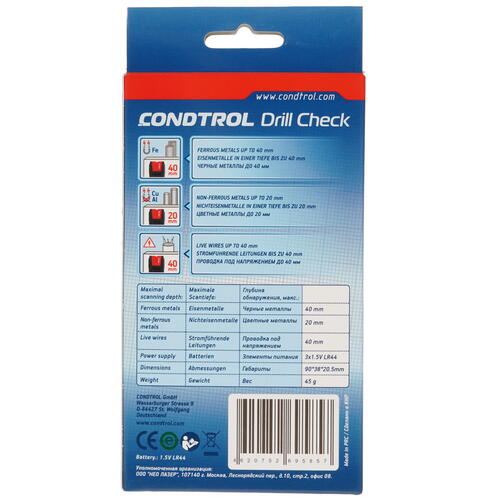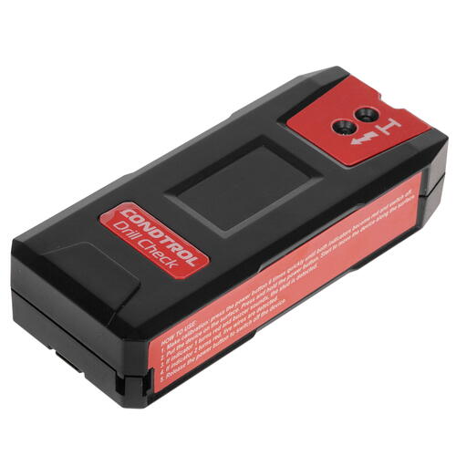 Устройство CONDTROL Drill Check способно обнаружить действующие провода и стальной провод на глубине до 4 см, медные изделия на 2 см. При обнаружении искомых предметов срабатывают звуковые сигналы. Для работы детектора требуются батарейки LR44, емкости которых хватает на 6 часов. Данная модель весит всего 45 г и обладает размерами 3.8x9x2 см.