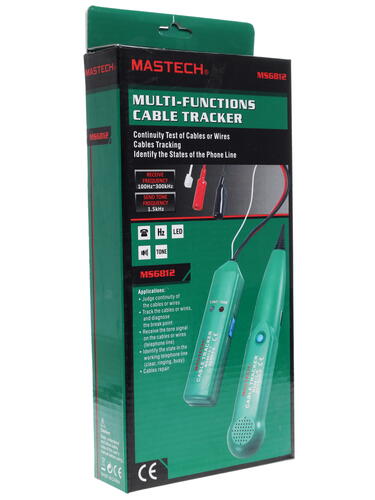 Кабельный тестер Mastech MS6812 дополнен системой поиска места обрыва и работает от батарейки типа «крона» с мощностью 9 B. Устройство весит 200 грамм, имеет сертификат качества и позволяет оперативно проверить наличие тонового сигнала телефонной линии или кабеля. Детектор позволяет значительно упростить работы по прокладке телекоммуникаций, а также поможет избежать проблем при ремонтных работах.