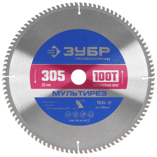 Мультирез Зубр 36907-305-30-100 - многозадачный пильный диск для точного распила самых разнообразных материалов. Применяется для распила алюминиевого профиля, цветных металлов, композитных материалов, ламинированных плит, полимерных и эпоксидных материалов.