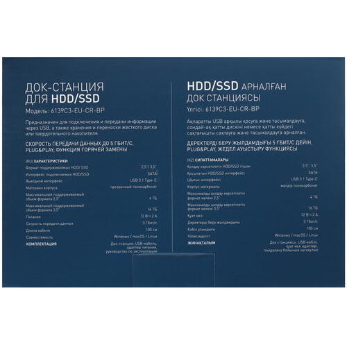 Док-станция для накопителей DEXP 6139C3-EU-CR-BP совместима с ОС Windows, Linux, macOS, что предполагает ее удобную синхронизацию с ПК. Корпус станции изготовлен из прозрачного поликарбоната, устойчивого к деформациям и пожелтению. В комплекте с док-станцией имеется блок питания 12 В и кабель USB длиной в 100 см, это обеспечивает комфортное подключение станции к компьютеру.