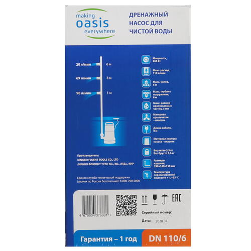 Насос дренажный DN 110/6 "making Oasis everywhere" отличается высокой производительностью. Пропускная способность устройства равна 110 л/мин (что эквивалентно 6.6 м³/ч). Подключение насоса к сети осуществляется с помощью 10-метрового шнура. Максимальная потребляемая мощность модели составляет 200 Вт. Насос укомплектован руководством по эксплуатации. Упаковка – презентабельно выглядящая коробка.