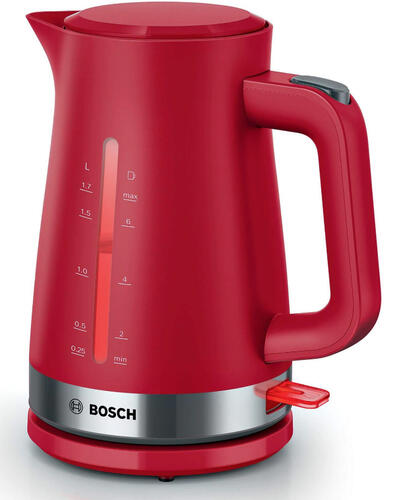 Электрочайник Bosch TWK4M224 вскипятит воду за считанные минуты. Объем чайника составляет 1,7 л. Модель выполнена в красном цвете.