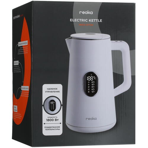 Электрочайник Reoka RKEK-01TSW представлен в белом корпусе с двойными стенками и функцией поддержания температуры до 24 ч. Скрытый ТЭН облегчает очистку емкости от накипи. Резервуар на 1.5 л воды дополнен удобной мерной шкалой. На корпусе есть дисплей с индикацией температуры и активных режимов.
