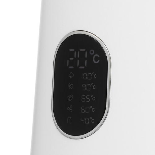 Reoka RKEK-01TSW со ступенчатым терморегулятором позволяет настраивать уровень нагрева от 40 °C до 100 °C. Модель дополнена звуковыми сигналами при установке на подставку и нагреве до заданной температуры.