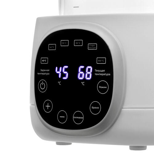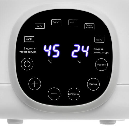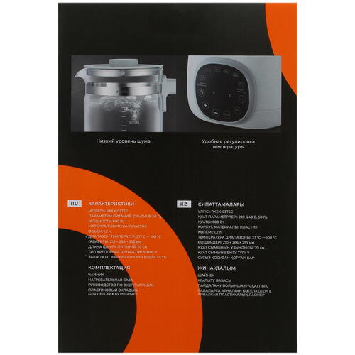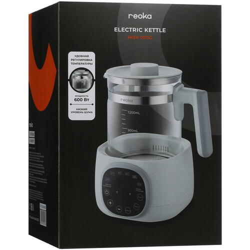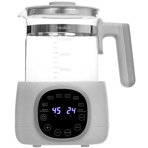 Электрочайник Reoka RKEK-03TSG оборудован подставкой с электронной панелью управления. Она позволяет выбрать температурный режим, запрограммировать таймер на автоматическое выключение и открывает доступ к остальным опциям. Вкладыш служит для подогрева детских бутылочек. Защитная технология ограничивает включение прибора при недостатке жидкости в 1.2-литровом резервуаре.