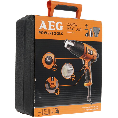 Плавная регулировка рабочей температуры в диапазоне от 90 до 600 градусов вместе со встроенным температурным датчиком позволит более гибко и точно настроить параметры работы технического фена AEG HG600VK. Имеется две предустановленных скорости воздушного потока: 300 л/мин и 500 л/мин. Кейс в комплекте решит вопрос удобного и безопасного хранения и транспортировки устройства. Набор насадок избавит вас от необходимости приобретения дополнительных аксессуаров для фена. Вес представленной модели равен 0.6 кг.