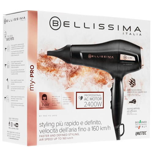Прибор Imetec Bellissima MY PRO 11728 действует от стандартной сети с предельной мощностью 2400 Вт. Комфортной эксплуатации способствует система независимой регулировки двух скоростей и четырех температурных режимов. Оборудование дополнено программой холодного обдува и надежной защитой от перегрева.