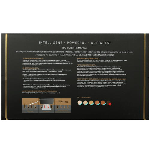 Фотоэпилятор SmoothSkin Pure является безопасным и мощным средством для эпиляции. Технология фотоэпиляции со спектром светового луча 515-1100 НМ обеспечивает подавление роста волос и позволяет поддерживать гладкость кожи длительное время. Встроенный сенсор цвета кожи автоматически определяет тип эпидермиса, после чего устанавливает нужную мощность вспышки. Данная модель оснащена тремя режимами интенсивности вспышек. Датчик контакта с кожей защищает глаза от вредного воздействия импульсной световой вспышки, поэтому прибор работает только при полном контакте. В комплекте с фотоэпилятором SmoothSkin Pure поставляются блок питания и сетевой кабель.