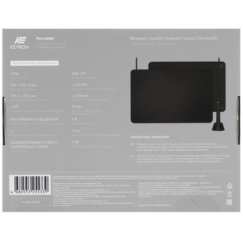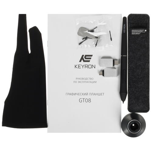 Панель с 4 программируемыми кнопками позволяет назначать функциональность каждой из них. Пассивный стилус получает питание от сигнала при касании к рабочей области, поэтому не требует зарядки и замены батареек. Поддержка 8192 уровней чувствительности к нажатию гарантирует точность ввода. В наборе с KEYRON GT08 предусмотрены кабель USB, сменные наконечники, подставка, чехол и перчатка для рисования.