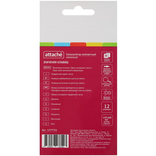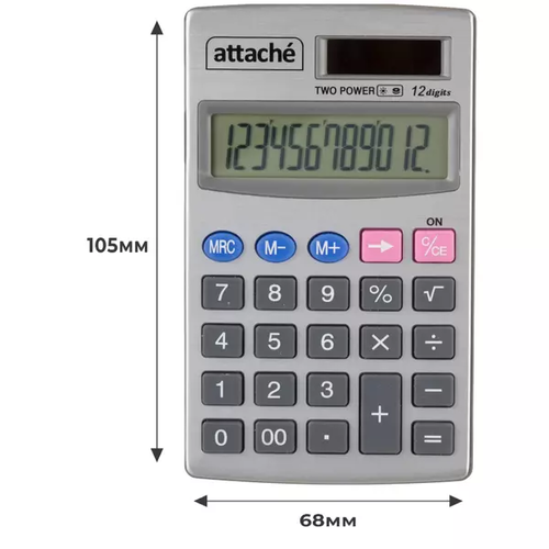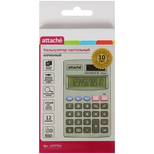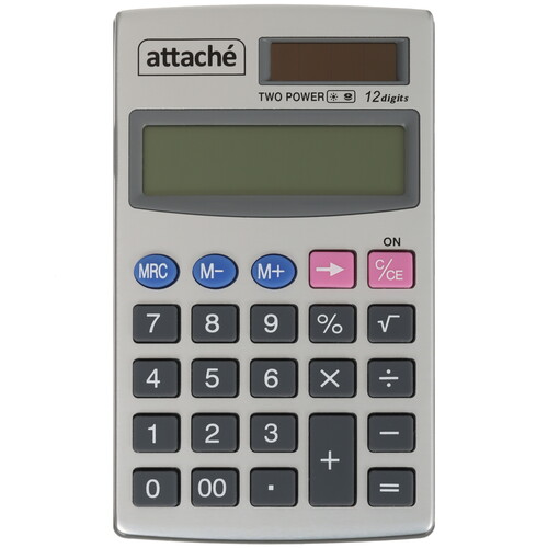 Калькулятор Attache карманный в пластиковом корпусе с 12-разрядным ЖК-дисплеем. Имеет оптимальный набор вычислительных функций: основные математические операции, расчет процентов, извлечение квадратного корня, запоминание промежуточных результатов. Нет кнопки коррекции вычислений. Удобная клавиатура снабжена кнопкой ввода двойного нуля. В калькуляторе имеется два источника питания: солнечная батарея и батарейка LR1130.
