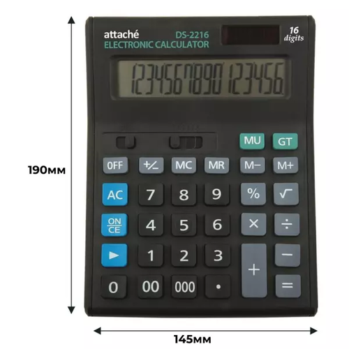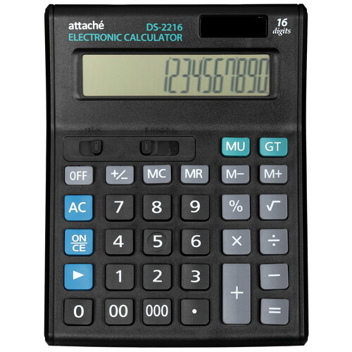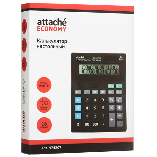 Калькулятор Attache Economy настольный в пластиковом корпусе с 16-разрядным ЖК-дисплеем. Имеет оптимальный набор вычислительных функций: основные математические операции, расчет процентов, извлечение квадратного корня, запоминание промежуточных результатов. Позволяет корректировать введенное число, задавать настройки округления и количества знаков после запятой. Удобная клавиатура снабжена кнопкой ввода двойного и тройного нуля. Питание калькулятора автоматически отключается после пяти минут бездействия. В калькуляторе имеется два источника питания: солнечная батарея батарейка AA.