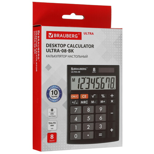 Устройство Brauberg ULTRA-08-BK обладает расширенными функциями, которые могут потребоваться в бухгалтерии. Прибор умеет выполнять вычисления с памятью, возводить числа в степень, вычислять проценты и квадратный корень. Калькулятор отключается кнопкой OFF или автоматически через несколько секунд бездействия, а включается нажатием на любую кнопку.