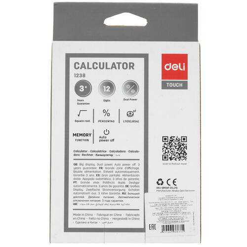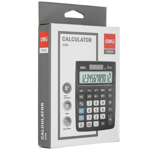 Настольный калькулятор Deli E1238 черного цвета имеет разрядность 12 и выполняет точные расчеты. Устройство обладает следующими функциями: общее суммирование, процентные расчеты, расчет наценки, независимая память, коррекция ввода, вычисление квадратного корня. Для работы Deli E1238 используются батарейки типа LR54 и встроенный солнечный элемент. Размер устройства 145.1х104.5х27.4 мм.
