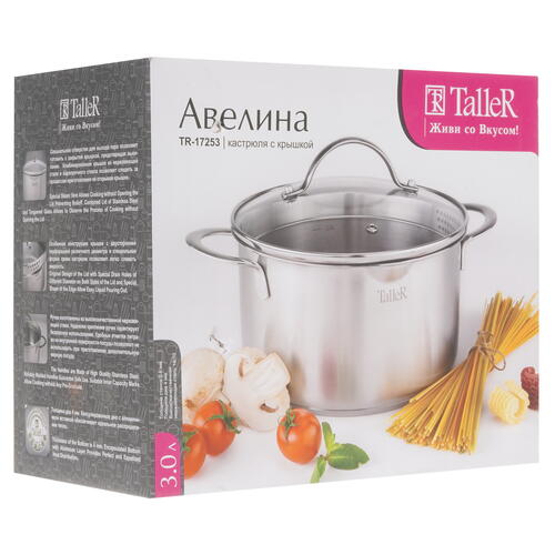 Емкость Taller Авелина TR-17253 вмещает 3 л и дополняется внутри шкалой с отметками уровня воды. Функциональная стеклянная крышка оснащена удобной ручкой, отверстием для пара и отверстиям в торце для слива воды. На самой кастрюле также имеется небольшая выемка, что упрощает варку овощей и лапши.