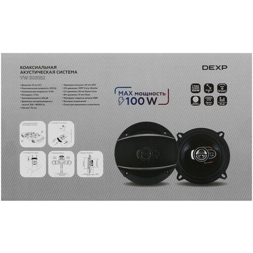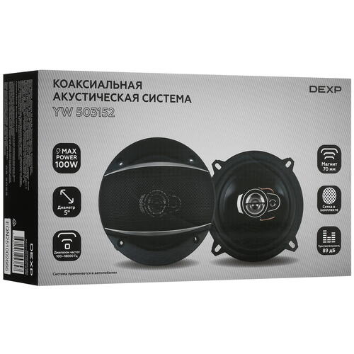 Коаксиальная АС DEXP YW 503152 способна воспроизводить детализированное и насыщенное звучание. Она состоит из двух динамиков диаметром 5 дюймов с выходной мощностью до 100 Вт и предназначена для установки в автомобиль. Диффузор из целлюлозы и подвесы с применением резины NBR обеспечивают формирование реалистичного звука без искажений при разном уровне громкости. Стальная корзина динамика гарантирует жесткость конструкции и устойчивость к повреждениям. На передней стороне АС DEXP YW 503152 установлены декоративные металлические сетки.