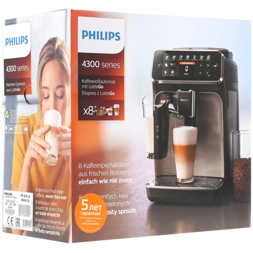Кофемашина Philips EP4341/50 дополнена интуитивно понятной панелью управления в верхней части корпуса, используя которую вы установите желаемую крепость, объем и температуру напитка. Наслаждайтесь крепким ароматным кофе с непревзойденно густой пенкой, не выходя из дома – в этом вам поможет автоматический капучинатор. Чтобы значительно облегчить процесс последующего ухода за устройством, в нем появился вместительный контейнер для отходов, а также лоток для капель.