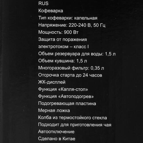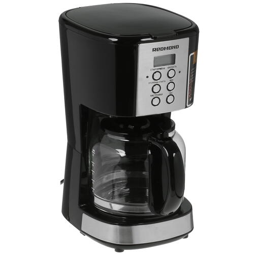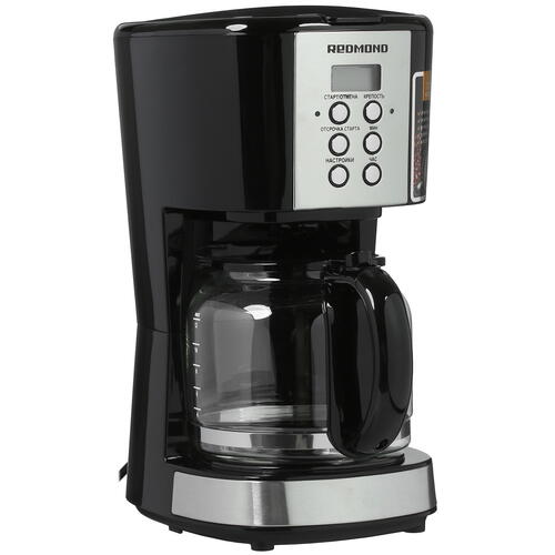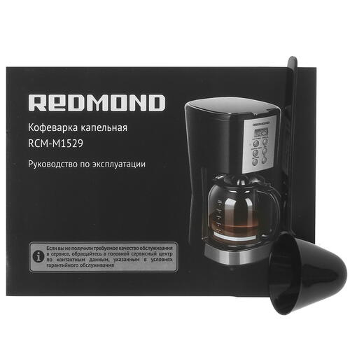 Модель укомплектована кувшином, изготовленным из термостойкого стекла, в который поступает готовый напиток. Его можно использовать также и для заваривания трав, чая и других напитков. Такой заварник выдерживает температуру +150 °С и легко очищается в воде. На лицевой части корпуса находится электронная панель управления, содержащая кнопки и дисплей. В состоянии покоя прибора на дисплее отображается время. Особенность кофеварки REDMOND RCM-M1529 в использовании многоразового фильтра, позволяющего получать очищенный напиток, вкус которого не будет испорчен примесями, содержащимися в воде.