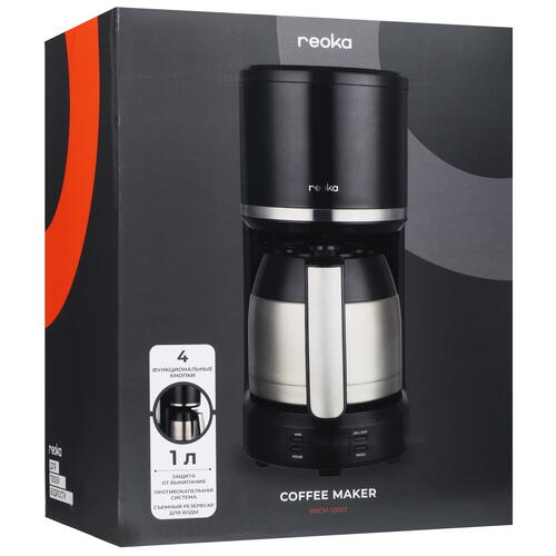 Кофеварка Reoka RKCM-1000T выполнена в корпусе компактных габаритов и благодаря мощному нагревательному элементу позволяет заваривать насыщенный ароматный кофе. Двойные изоляционные стенки поддерживают температуру, а плита подогрева не позволяет напитку остыть после приготовления. Резервуар для готового напитка обладает емкостью 1 литр и изготовлен из нержавеющей стали. На основании расположены ножки из прорезиненного материала. Технологии автоматического отключения и защиты от перегрева гарантируют высокую безопасность в пользовании Reoka RKCM-1000T.