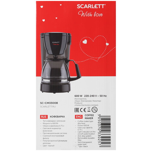 Кофеварка капельная Scarlett SC-CM33008 оснащена системой «анти-капля». В конструкции предусмотрен дополнительный поддон, встроенный под подставку для чашек. Все лишнее капли стекают в резервуар, тем самым стол или рабочая поверхность защищена от проливания кофе. Световой индикатор позволяет контролировать режим работы устройства и уровень воды. Панель управления кнопочная, с светодиодной подсветкой, что позволяет работать с кофеваркой даже в полной темноте. Встроенная плита подогрева сохраняет кофе горячим до 1–1,5 часа. В комплекте идет мерная ложка.