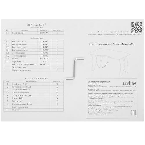 Aceline Respawn 01 оснащен столешницей с размерами 140x89.2 см для удобного размещения моноблока или ноутбука с контроллерами и другими устройствами. Ламинированное покрытие защищает материал от влаги, маскирует мелкие царапины и потертости. Мебель идет в комплекте с понятной инструкцией по сборке.