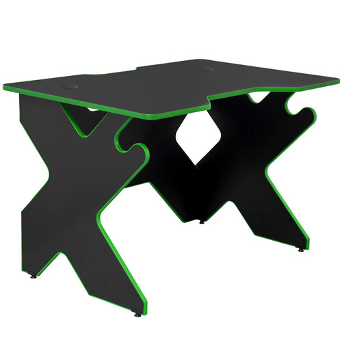 Игровой стол VMMGAME SPACE Dark с X-образной формой дополнен удобными крючками, кабель-каналами и регулируемыми ножками. Прочная мебель из ЛДСП с ламинированным покрытием легко очищается от пыли и пятен даже без помощи моющих средств. Зеленая кромка выполняет 2 важные функции: декор и защиту мебели от сколов.