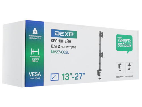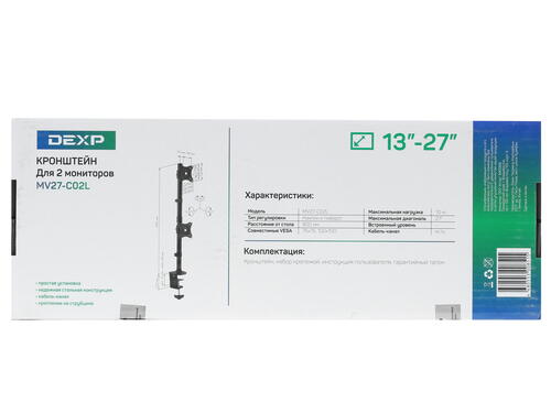 Универсальное крепление DEXP MV27-C02L – это надежный кронштейн, основой которого является струбцина, способная удержать два монитора. Модель поддерживает установку мониторов и телевизоров с диагональю в пределе 13"-27". Кронштейн выдерживает нагрузку до 10 кг, поэтому вы можете зафиксировать на нем или один большой, или два маленьких монитора – аксессуар легко справится со своей задачей – удержанием устройства.