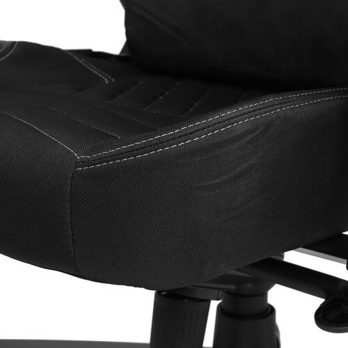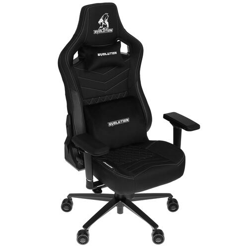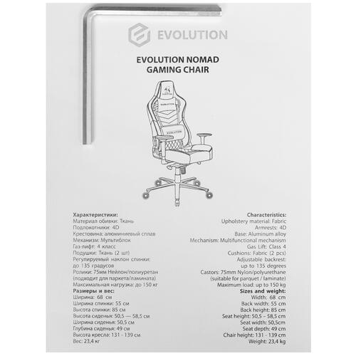 Кресло игровое Evolution NOMAD обладает широкой спинкой и сиденьем, внутри которых спрятан наполнитель из пенополиуретана. Материал отличает устойчивость к преждевременной усадке и потере упругости. Обивка представлена текстилем черного цвета, который с легкостью очищается от любых пятен. Металлическая опора выдерживает ежедневное воздействие веса до 150 кг.