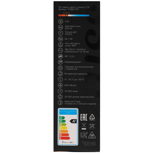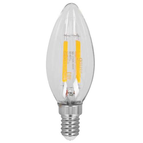 В комплект филаментных ламп Gauss Filament Crystal 103801105 включены лампы мощностью 5 Вт с прозрачными рассеивателями, работающие от однофазной бытовой сети. Благодаря минимальному уровню пульсации света лампочки при работе не утомляют глаза пользователя.
