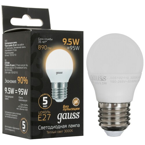 Устройство Gauss LED E27/9.5w излучает теплое свечение при потоке 890 лм и цветовой температуре 3000 К. Изделие с мощностью 9.5 Вт станет отличной заменой менее энергоэффективной лампы накаливания на 95 Вт. Диаметр лампы составляет 4.5 см, а общая длина равна 8.5 см.