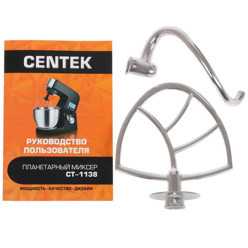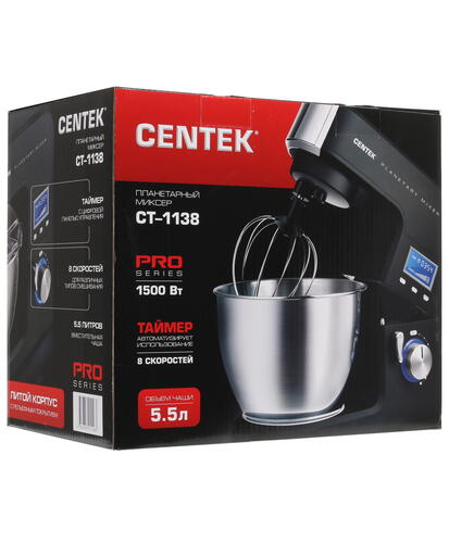 Корпус миксера изготовлен из алюминия, а чаша выполнена из нержавеющей стали и имеет объем 5.5 л. Для удобства в процессе взбивания или смешивания продуктов миксер оборудован таймером. В комплекте с миксером Centek CT-1138 поставляются 3 сменные насадки для замешивания теста и взбивания ингредиентов.