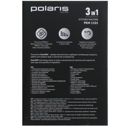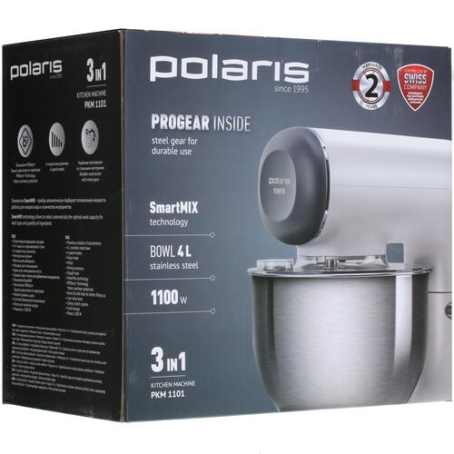 Polaris PKM 1101 поддерживает планетарное вращение, достигается это путем одновременного разнонаправленного вращения насадки и привода к насадке. Технология SmartMIX позволяет подобрать комфортную мощность для качественного смешивания продуктов, поддерживая 6 скоростных режимов и давая возможность воспользоваться импульсным режимом. Модель использует чашу объемом 4 л. Защиту двигателя от перегрева обеспечивает технология PROtect+. Эта кухонная машина обладает надежной конструкцией, включающей стальные шестерни. Для хранения кабеля в корпусе предусмотрен специальный отсек.