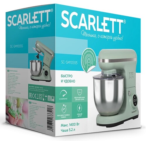 Планетарный миксер SC-SM10S55 мощностью 1400 Вт – незаменимый помощник на кухне! 8 скоростей и функция установки таймера позволят подобрать оптимальный режим для приготовления различных блюд. Стильный салатовый цвет прибора, металлическая декорация и сенсорная панель управления отлично впишутся в интерьер любой кухни. В комплект входит крюк для замешивания густого теста, венчик для взбивания белков, лопатка для смешивания, а также чаша объемом 5.2л. Венчик и чаша миксера выполнены из нержавеющей стали, что делает их пригодными для мытья в посудомоечной машине. Крышка с отверстием для добавления ингредиентов поможет сохранить рабочую поверхность в чистоте, а нескользящее основание обеспечит устойчивость прибора в работе с продуктами любой консистенции. По истечению заданному времени на таймере прибор автоматически выключится, что делает работу прибора наиболее удобной. Металлические шестеренки, которые обеспечивают работу важнейших элементов, защита мотора от перегрева и перегрузки, а также защита от включения с открытой чашей сделают эксплуатацию прибора эффективной и безопасной.