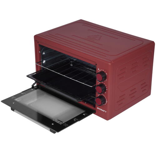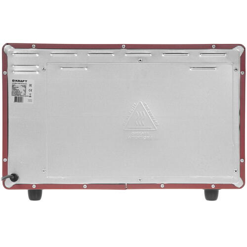 Мини-печь Kraft KF-MO 3200 R выполнена в красном корпусе и устанавливается на устойчивые прорезиненные ножки. Она содержит внутри верхний и нижний нагреватели, которые можно включать отдельно или комбинировать. Для управления режимами работы используется поворотная ручка справа от дверцы. Над ней расположены поворотные элементы для настройки температуры и времени приготовления.
