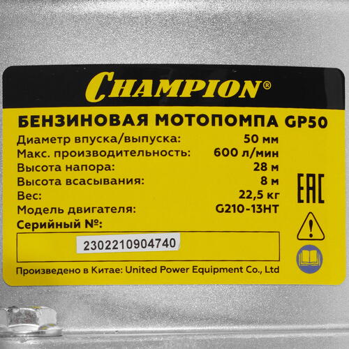 Мотопомпа CHAMPION GP50 управляется при помощи трех рычагов, отвечающих за воздушную заслонку, интенсивность подачи топлива и число оборотов двигателя. За час непрерывной работы эта модель способна перекачать до 36000 литров жидкости, обеспечивая ее подъем на высоту до 26 метров. При этом максимальная глубина всасывания может достигать 8 метров. Устройство оснащено прочной металлической рамой, которая позволит устойчиво установить мотопомпу в любом удобном месте.