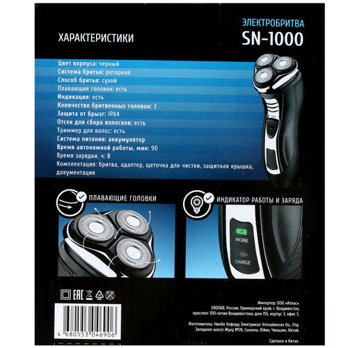 DEXP SN-1000 использует роторную систему бритья и предназначена для сухого бритья. В процессе бритья задействованы три головки, что способствует более гладкому и тщательному бритью. На корпусе предусмотрен индикатор зарядки, который позволяет отследить состояние заряда батареи, чтобы знать, когда потребуется зарядка устройства, чтобы продолжить пользоваться устройством от аккумулятора. Конструкция корпуса предполагает наличие отсека для сбора волосков, что позволяет сохранить чистоту.