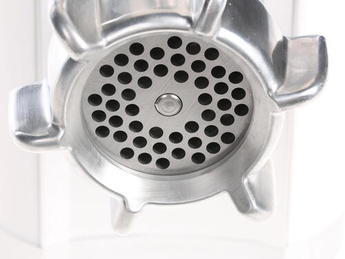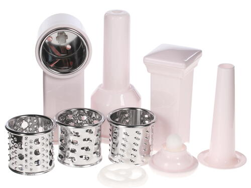 Комплектация дополнена 3 перфорированными дисками для фарша, 1 насадкой-тёркой, 1 насадкой для приготовления колбас, а также насадкой-соковыжималкой и насадкой для кеббе. Предусматривается встроенный отсек для хранения всех комплектующих изделий. Для большей устойчивости мясорубка оснащена прорезиненными ножками.