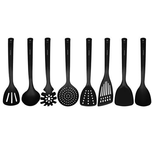 Набор кухонных предметов inhouse GINA IHGIN8BL выполнен из нейлона. Устойчивость к высокой температуре и накапливанию запахов, а также бережное отношение к посуде – основные достоинства подобного материала. Ручки изделий содержат отверстия для последующего размещения на специальном держателе.