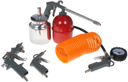 Набор пневмоинструмента Калибр НП-5Н включает в общей сложности 5 предметов и предоставляет ряд полезных приспособлений, необходимых для работы с пневмокомпрессором. В комплекте представлены краскопульт для нанесения лакокрасочных покрытий, насадки для подкачки шин, распыления воды и продувки. К ним прилагается 5-метровый витой шланг, рассчитанный на высокое рабочее давление. В наборе имеется и манометр, позволяющий в любой момент узнать текущее давление в ресивере компрессора.
