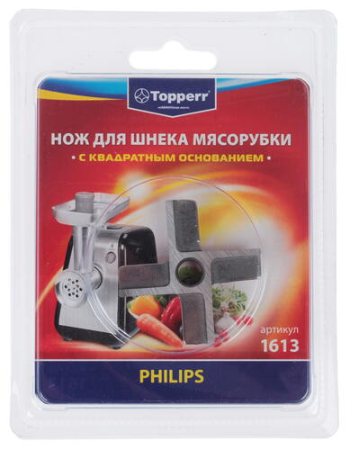 За счет нержавеющей стали, из которой изготовлен нож для шнека Topperr 1613, исключена возможность его коррозии в процессе эксплуатации. Параметры ножа предполагают его использование в мясорубках Philips. Посадочное основание у ножа выполнено в форме квадрата размером 9 мм. Толщина ножа составляет 10 мм, а его внешняя окружность – 57 мм. За счет точных размеров нож легко закрепляется на шнеке и довольно плотно прилегает к решетке мясорубки, обеспечивая тем самым хорошее перемалывание ингредиентов.