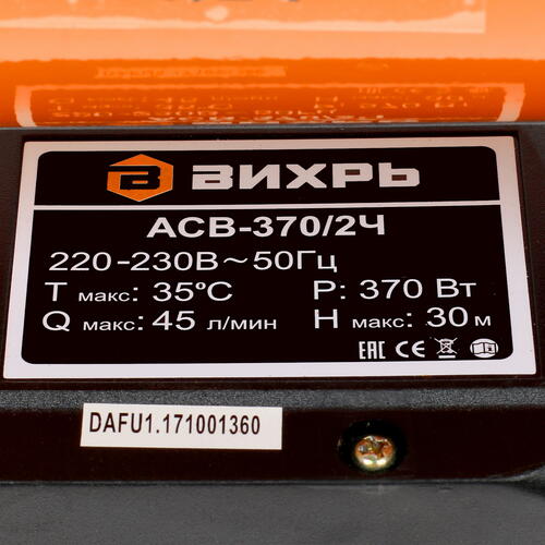 Станция Вихрь АСВ-370/2Ч оснащена вихревым насосом, действующим с мощностью 370 Вт. Оборудование обладает производительностью, равной 45 л/мин, и пропускной способностью, достигающей 2.7 м3/час. Допускается взаимодействие с водой при температуре, не превышающей 35 градусов. Безопасность и надежность эксплуатации обеспечивается благодаря защите механизма от перегрева.