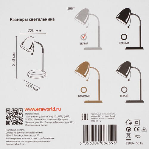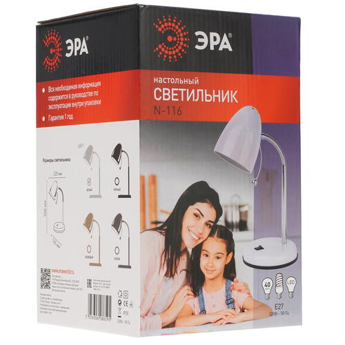 При создании настольного светильника ЭРА N-116-Е27-40W-W производитель отдал предпочтение первоклассному металлу, которому не страшны наиболее агрессивные внешние воздействия. Вы не сможете не оценить по достоинству гибкую стойку представленной модели, что обеспечивает возможность быстрого изменения угла падения излучаемого света. Прежде чем испробовать аксессуар в деле, потребуется осуществить установку лампочки с цоколем Е27. Даже при длительном функционировании прибор не вызывает неприятных ощущений в глазах, позволяя своему обладателю комфортно заниматься рабочими или учебными вопросами.