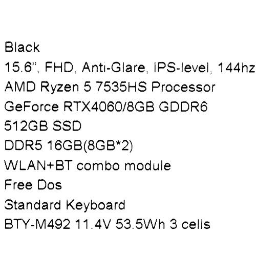 Full HD (1920x1080), IPS, AMD Ryzen 5 7535HS, ядра: 6 х 3.3 ГГц, RAM 16 ГБ, SSD 512 ГБ, GeForce RTX 4060 для ноутбуков 8 ГБ, без ОС