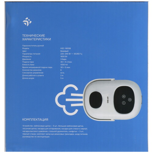 1600-ваттный нагревательный элемент пароочистителя Dexp HSC-1600B обеспечивает рабочую готовность через 15 с. Устройство подключается к сети с помощью 5-метрового шнура.